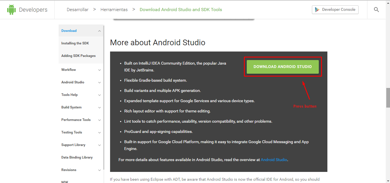 Android Studio is the development environment used for the development of Android apps and it includes the downloading of Android Development Kit (SDK) along with OpenJDK Java development environment.