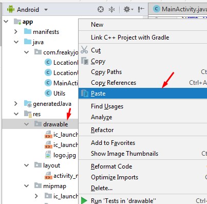 Right click on "drawable" folder then press "Paste" option , it would paste that specific selected picture into drawable folder.