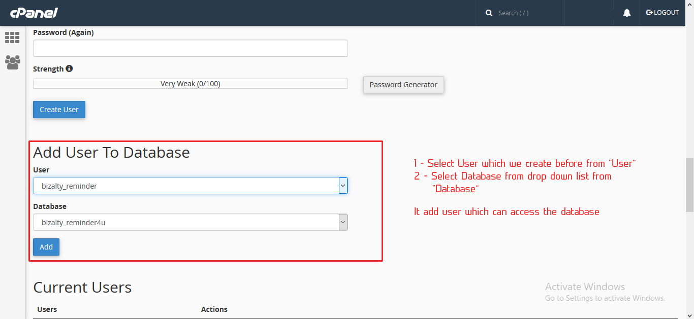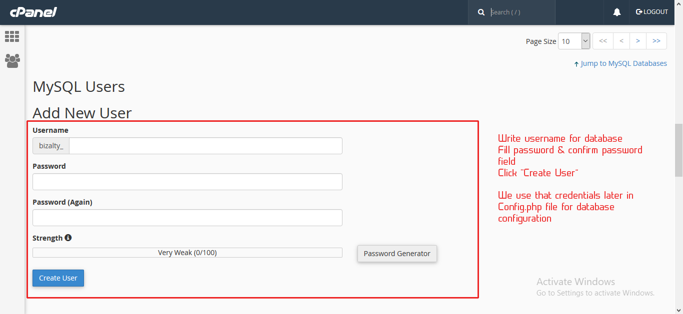 Create new user for database by writing username & password for database.