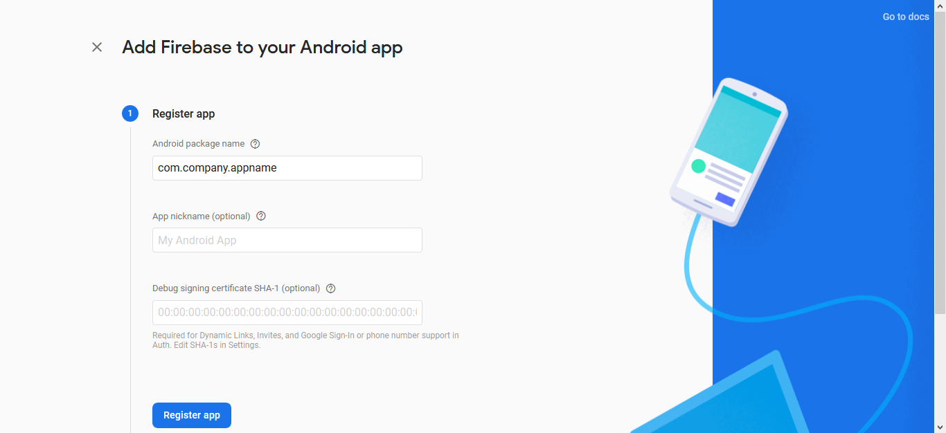 Write your package name , app name & debug sha-1 key (optional) then click "Register App" .