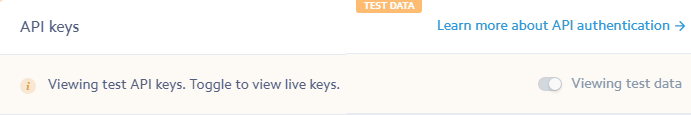 Your account will have two sets of API keys – Live and Test. In order to get access to both of them, you will need to use the toggle switch in the left menu that says “View test data”. Clicking that switch will toggle between the live and test keys. Live keys will start with pk_ and sk_. The pk_ keys are the publishable keys. The sk_keys are the secret keys. Test keys will start with pk_test_ and sk_test_. The pk_ keys are the publishable keys. The sk_keys are the secret keys..
