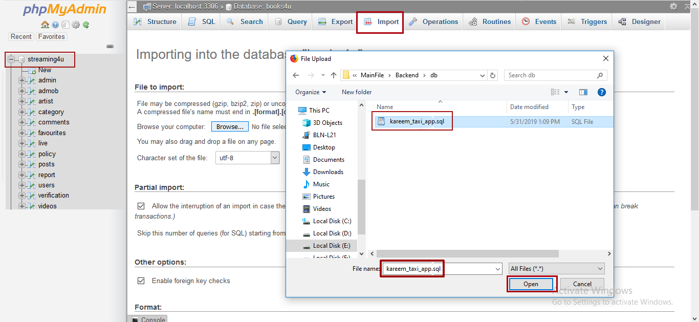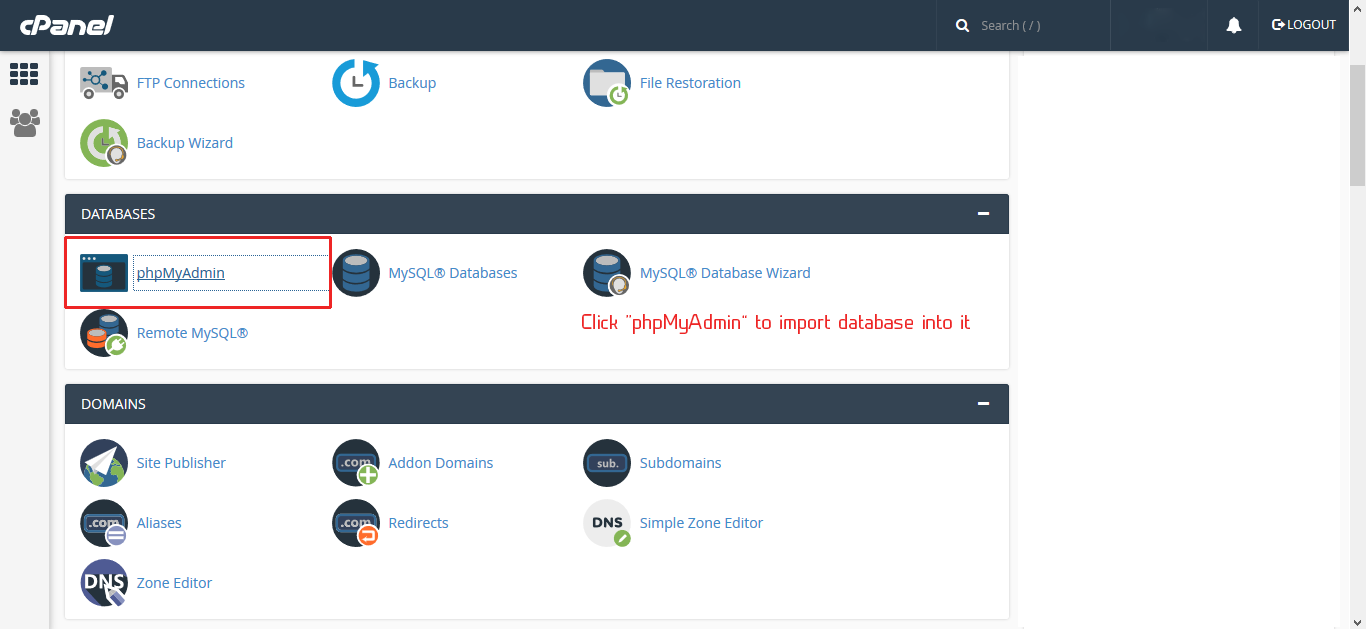 Click phpMyAdmin and select your database from list & import the sql file from.