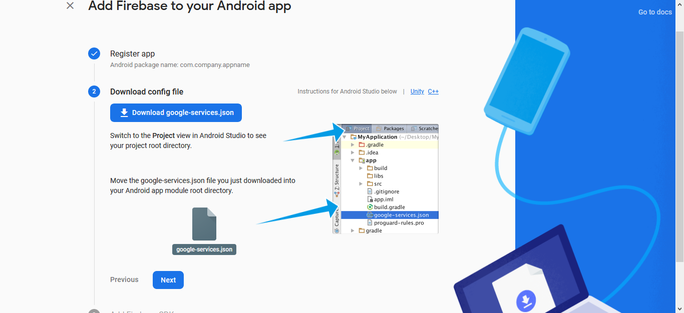 Click "Download google-service.json" file and copy into the project root folder of name "app" then click "Next".