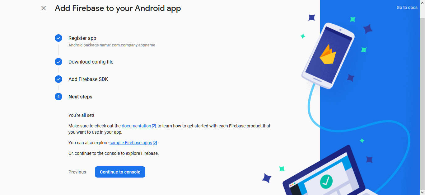 Click "Continue to console" to successfully add the app into Firebase.