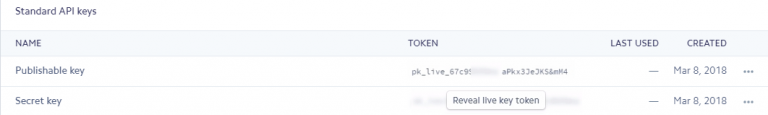 Your account will have two sets of API keys – Live and Test. In order to get access to both of them, you will need to use the toggle switch in the left menu that says “View test data”. Clicking that switch will toggle between the live and test keys. Live keys will start with pk_ and sk_. The pk_ keys are the publishable keys. The sk_keys are the secret keys. Test keys will start with pk_test_ and sk_test_. The pk_ keys are the publishable keys. The sk_keys are the secret keys..
